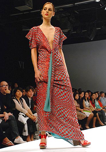 arun Sardana's lovely retro maxi was perfect down to the platform shoes -- but you have to be bold to carry off that neckline!