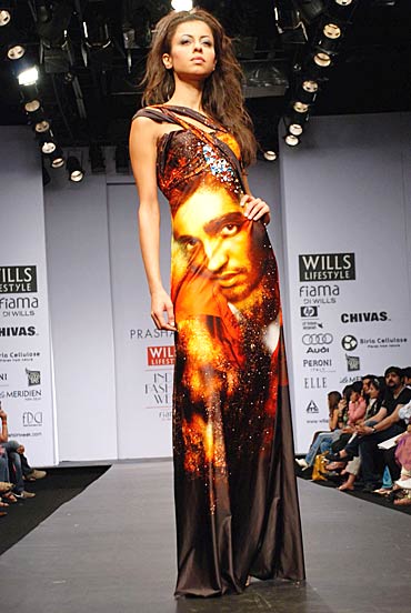 his is a potentially stunning gown, with touches of glimmer and shimmer -- but then you'd probably have to like Prashant enough to wear his face on your formal clothing!