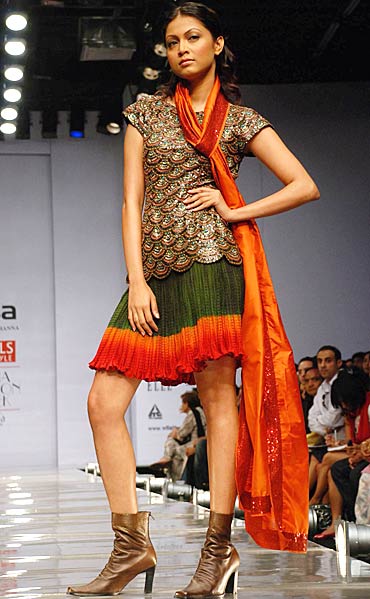 bhijeet Khanna presents a flirty little skirt in brightly-coloured permanent pleats.