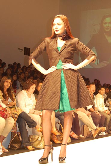 Sailex Ngairangbam was inspired by a cartoon character called 'Emily' -- his whole collection used tones of deep green, black and white. Here a striking green dress is teamed with fitted black jacket and matching overskirt.