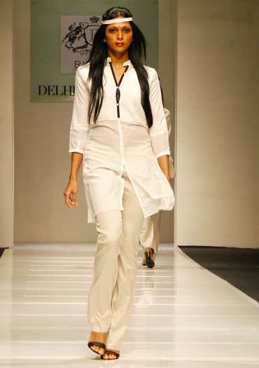Here she struts her stuff in a summery cropped white kurta with fitted lines and flowing cotton by Raghavendra Rathore.