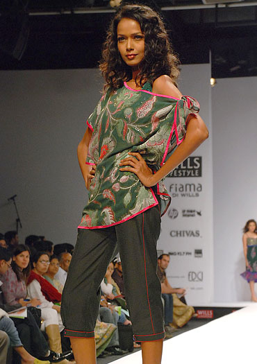 are a shoulder in this sassy green blouse that is in tune with the forest-y look of the rest of the line. The dark capris with red piping are uber chic.