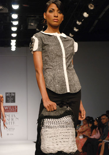 A long grey top worn over black looks very minimalistic and the slight hint of white brightens what would have otherwise been a dull outfit considerably. Again, the petrol-can inspired bag gets our vote.