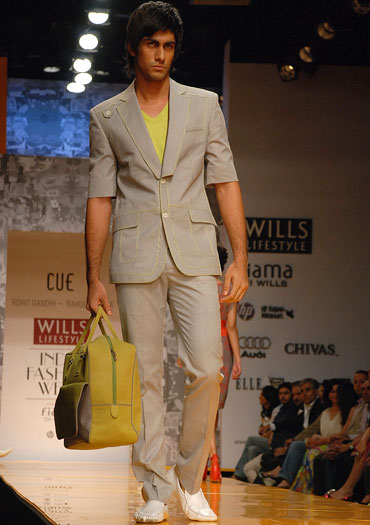 his slim-fitting grey suit with a neon tee peeking through is a tad too feminine! The cut would have been more flattering on a woman.