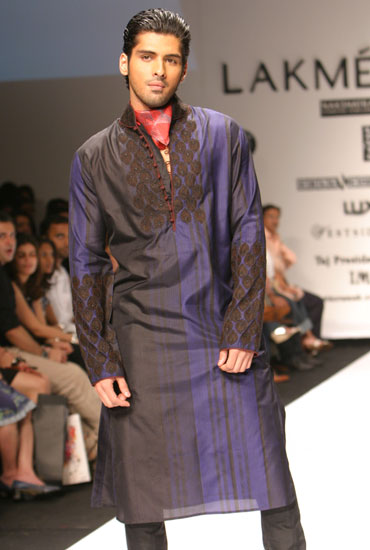 deep blue and black sherwani-style kurta is teamed with linen trousers.