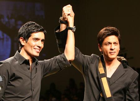 Malhotra on-stage with the night's big hit, Shah Rukh Khan. Note the custom gold sling, aka the bling sling, which Manish designed for King Khan.