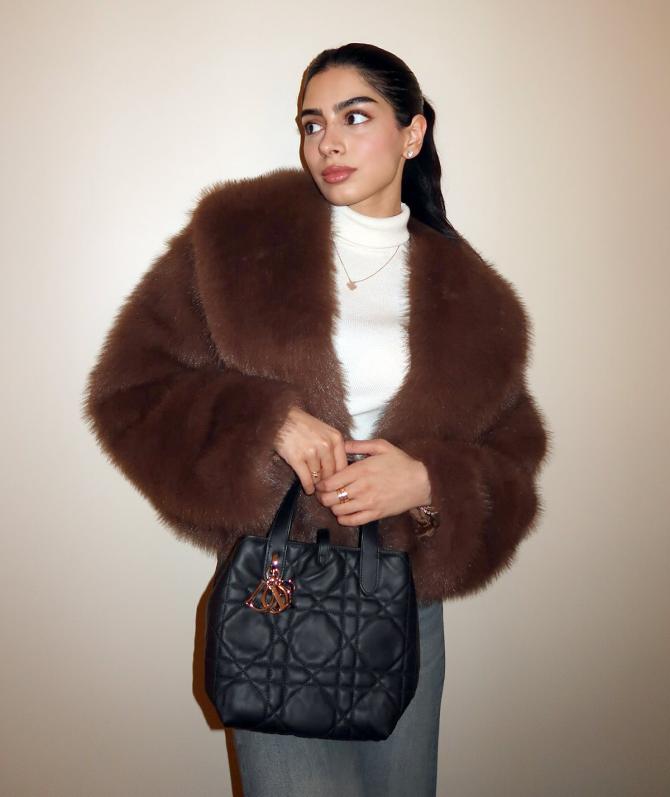 IMAGE: For the girl who wants to look like a diva without trying, Khushi Kapoor’s white turtleneck, brown jacket and grey skirt combo is your go-to. It’s cute and takes zero effort to nail. Photograph: Kind courtesy Khushi Kapoor/Instagram