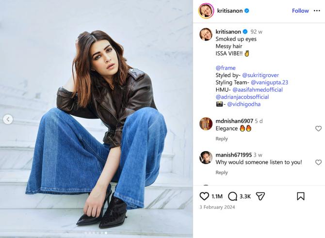 IMAGE: Channel your inner baddie by taking inspiration from Kriti Sanon’s brown belter jacket look paired with bell bottoms and boots. Photograph: Kind courtesy Kriti Sanon/Instagram
