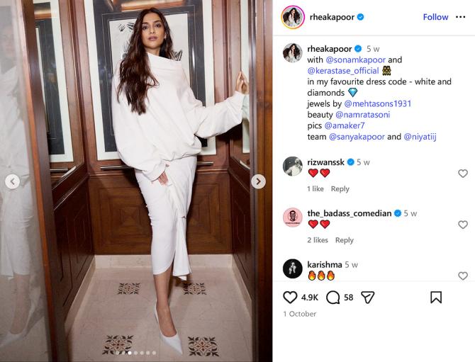 IMAGE: Take a cue from Sonam Kapoor, who turns basics into a fashion moment. She wears an oversized sweatshirt with a draped skirt and pumps, proving that couture can totally be comfy. Photograph: Kind courtesy Rhea Kapoor/Instagram