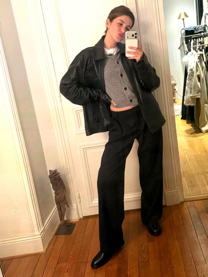 IMAGE: Shanaya Kapoor masters the layering game with a white tee, grey cardigan and black jacket teamed with trousers and boots. It’s perfect for a chic airport appearance. Photograph: Kind courtesy Shanaya Kapoor/Instagram