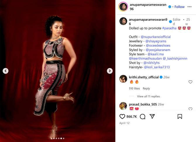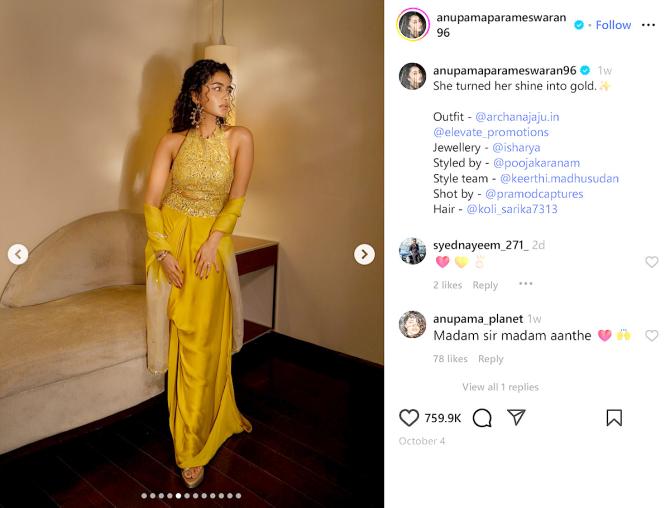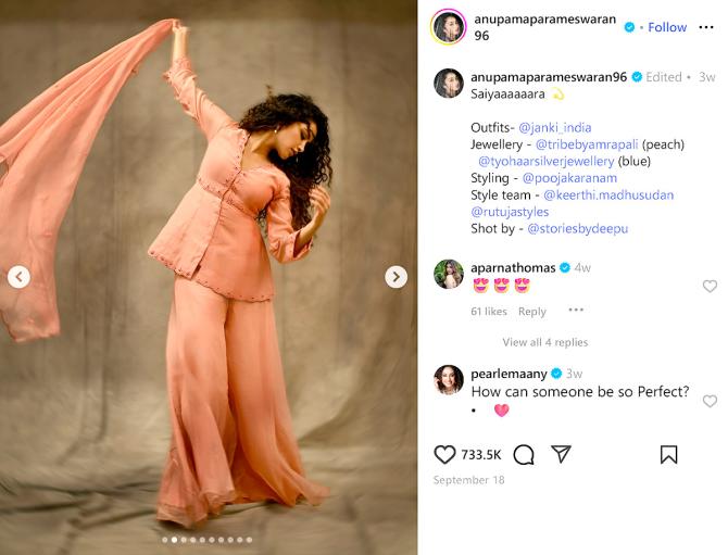 IMAGE: Anupama keeps it easy in a brocade sharara suit with barely-there accessories. Perfect for girls who aren’t into all the extra frills (or managing a dupatta mid-party). All photographs: Anupama Parameswaran/Instagram