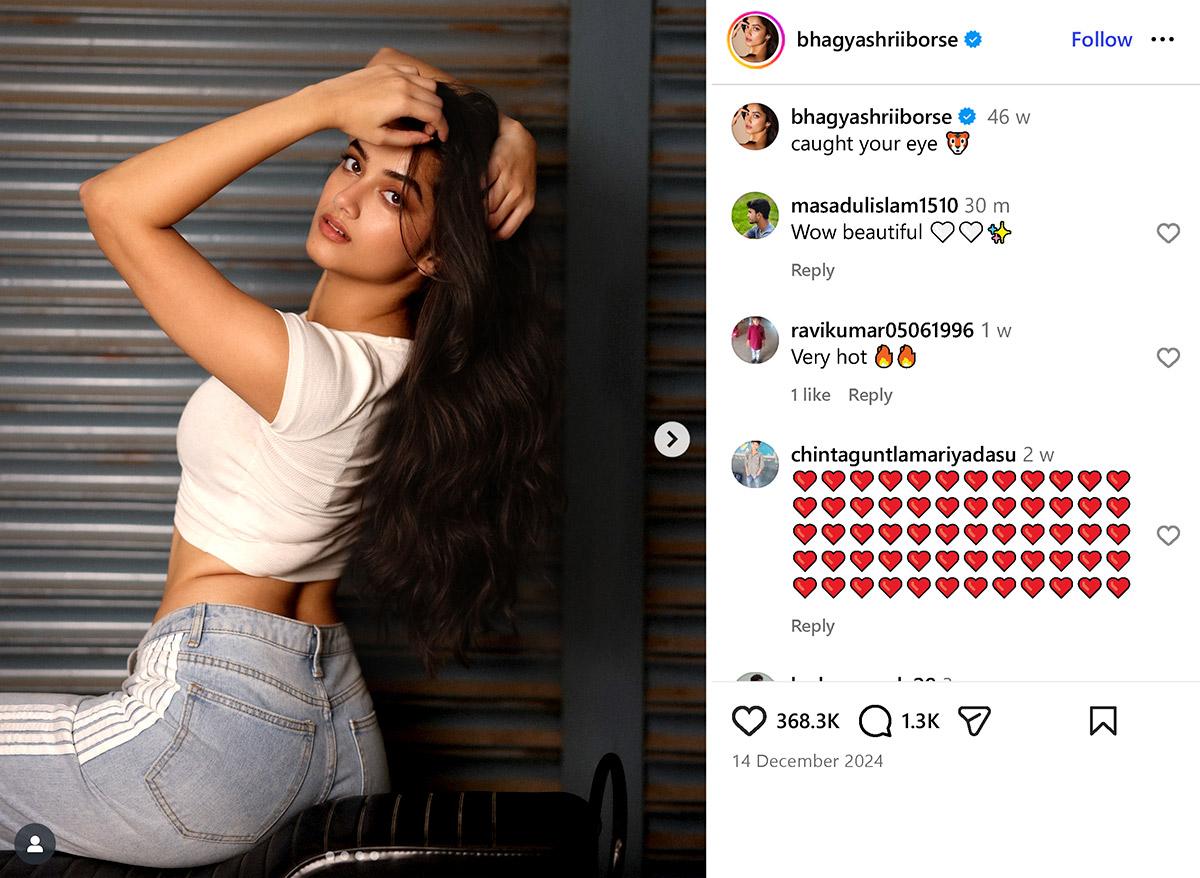 IMAGE: Bhagyashri keeps it crisp in a white crop top teamed with light-wash denim, a combo that never misses. Her jeans come with clean white side stripes matching the top.