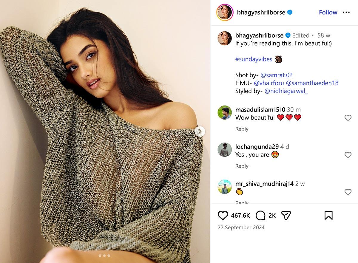 IMAGE: Knitted tops are an all year rounder for when you want that cozy, fresh look. Bhagyashri complements hers with natural, dewy makeup.