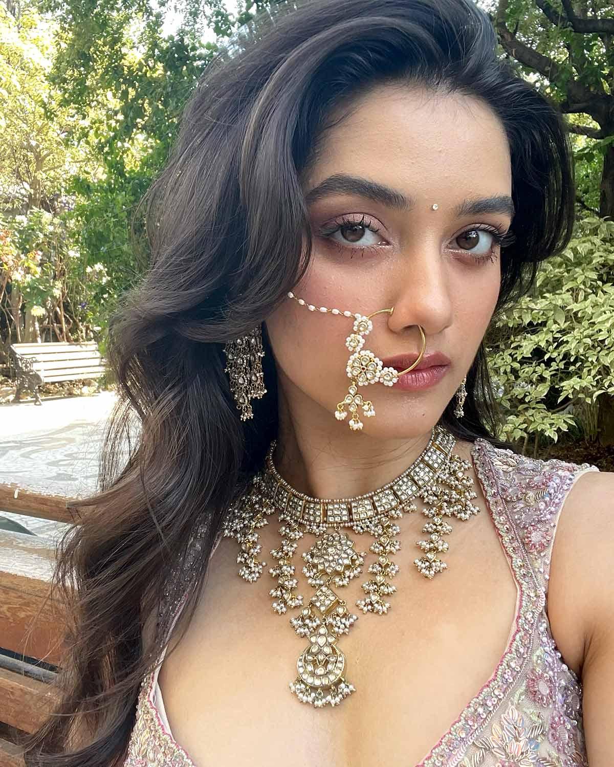 IMAGE: Bhagyashri shows how to boost soft makeup this shaadi season by going all out with accessories; she wears a statement choker, earrings and a nath.