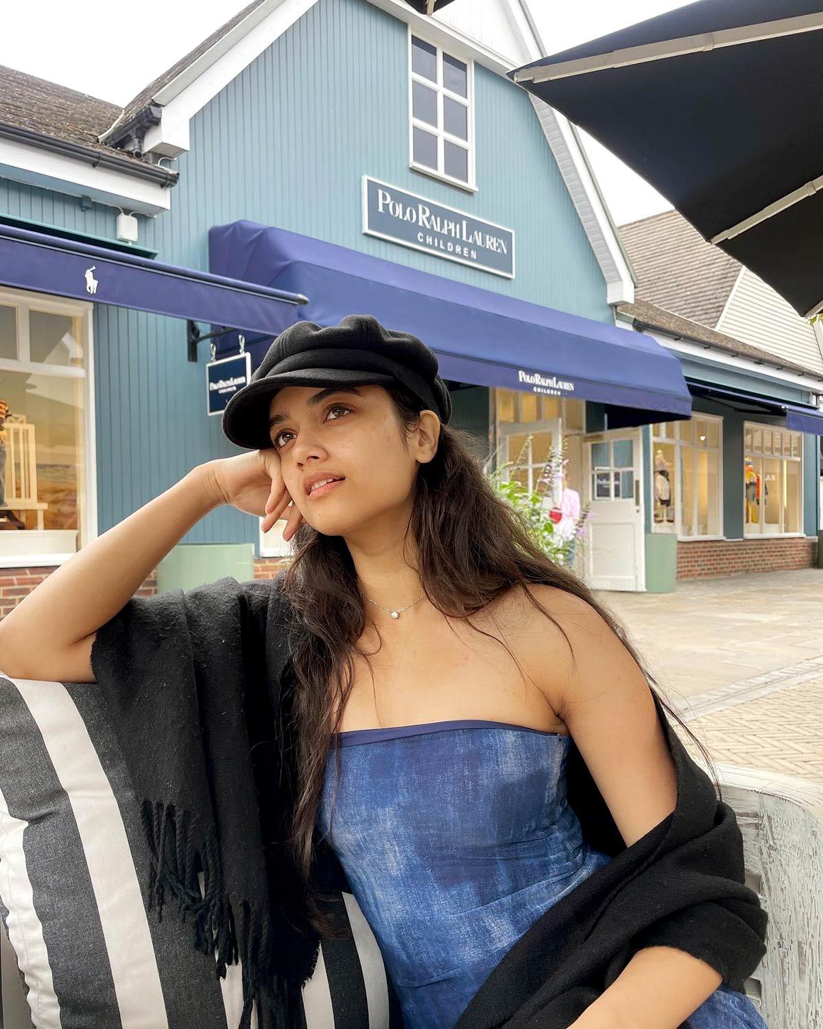 IMAGE: On vacation, Bhagyashri skips makeup and lets styling do the work, pairing a strapless dress with a shawl and a beret hat. It’s the perfect ‘DND, I am on a holiday’ look.