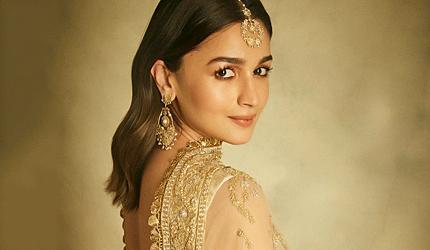 IMAGE: Alia Bhatt looked like molten gold in a dripping lehenga that screamed drama. Why buy bullion when you can twirl in a treasure like this? Photograph: Kind courtesy Alia Bhatt/Instagram