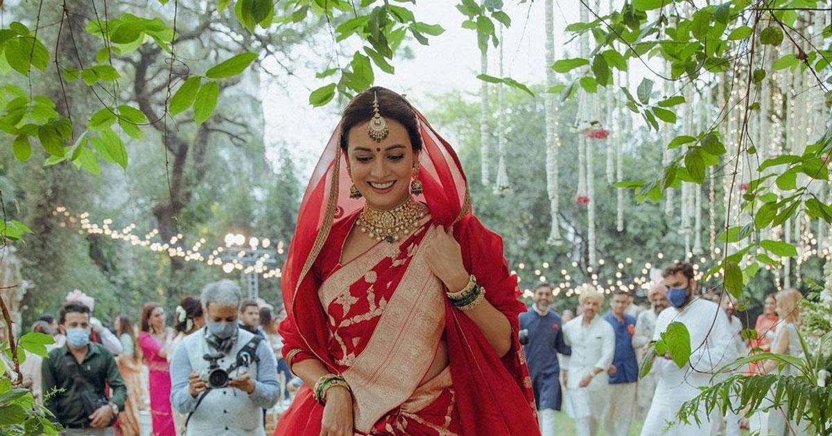IMAGE: Dia Mirza shared a pic of her dressed in a Raw Mango Varanasi silk brocade sari on her wedding day.