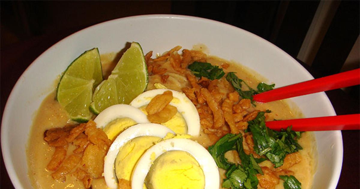 Burmese Khow Suey is a soup-cum-meal made with egg noodles, curried chicken and coconut milk.