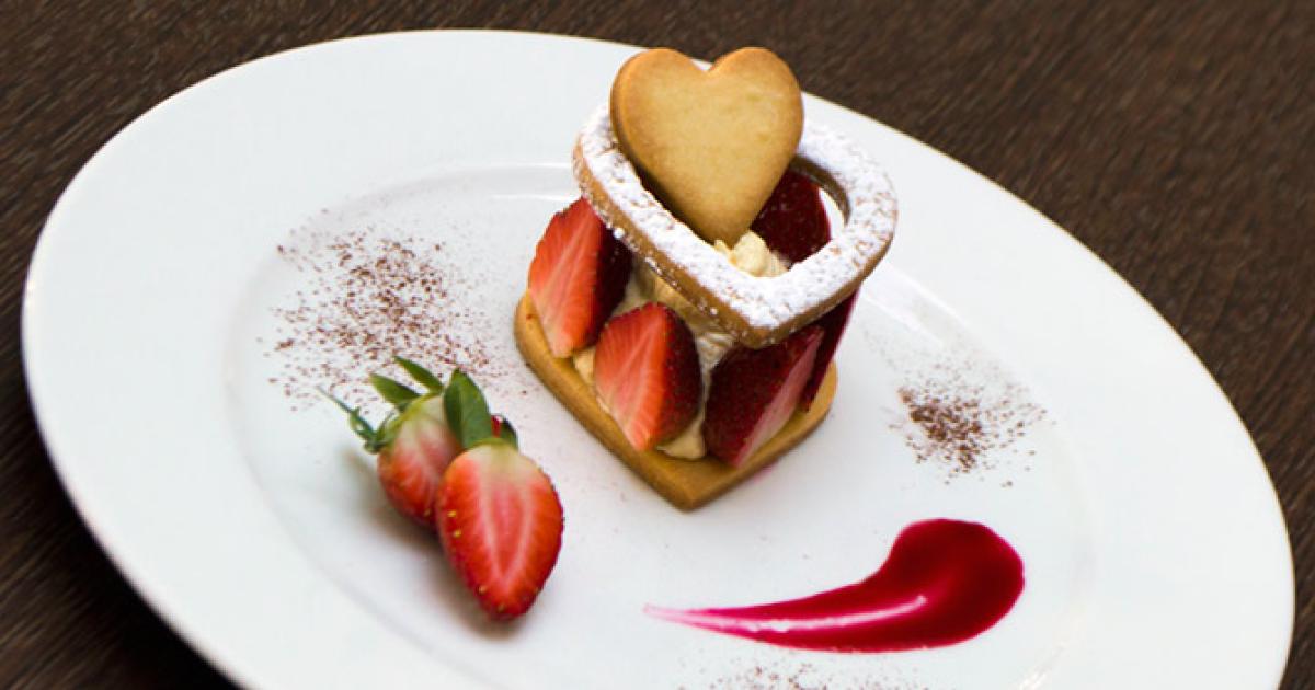 • On a plate, place the heart shaped baked sweet dough biscuit, put a tbsp of mascarpone cheese mixture, surround it with diced strawberry and cover it again with another heart shaped biscuit.