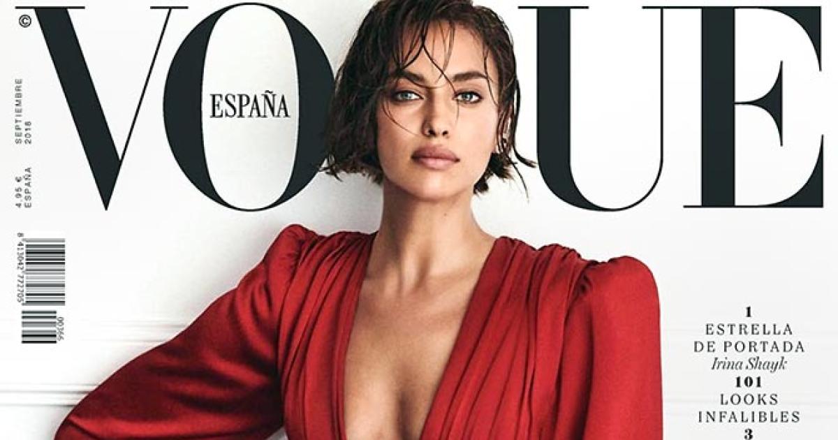 Model Irina Shayk sizzles on the cover of Vogue Spain's September edition in a gorgeous floor-sweeping Gucci gown.