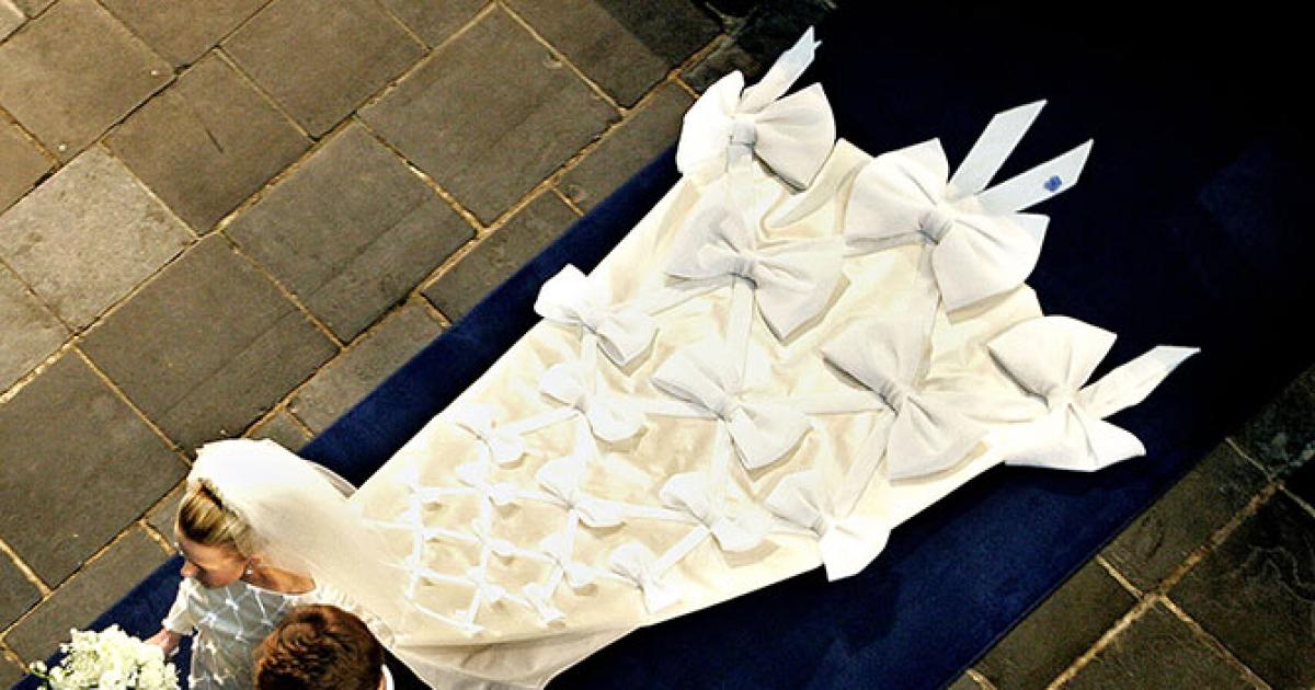 The bride wanted a memorable wedding dress, so she settled for a double-faced duchess satin gown with long sleeves, a flared skirt and 248 bows.