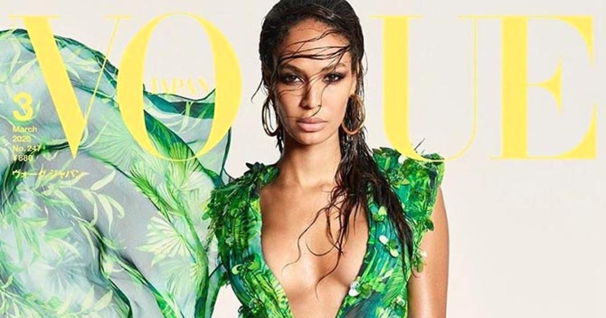 Dressed in a gorgeous tropical bikini, with an attached cape, she turns up the heat on the cover of Vogue Japan.