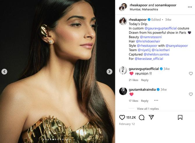 IMAGE: Trust Sonam Kapoor to take 'statement accessory' way too literally. She wears an ear cuff shaped like, well… an ear! Paired with a golden breastplate and diamond studs, it’s peak Sonam-level fashion. Photograph: Kind courtesy Rhea Kapoor/Instagram