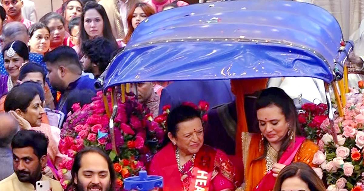 Nita Ambani's mother Purnima Dalal and her sister Mamta Dalal (she teaches at the Dhirubhai Ambani International School) made a grand entry on a rath. They were flanked by Nita Ambani and Anant.