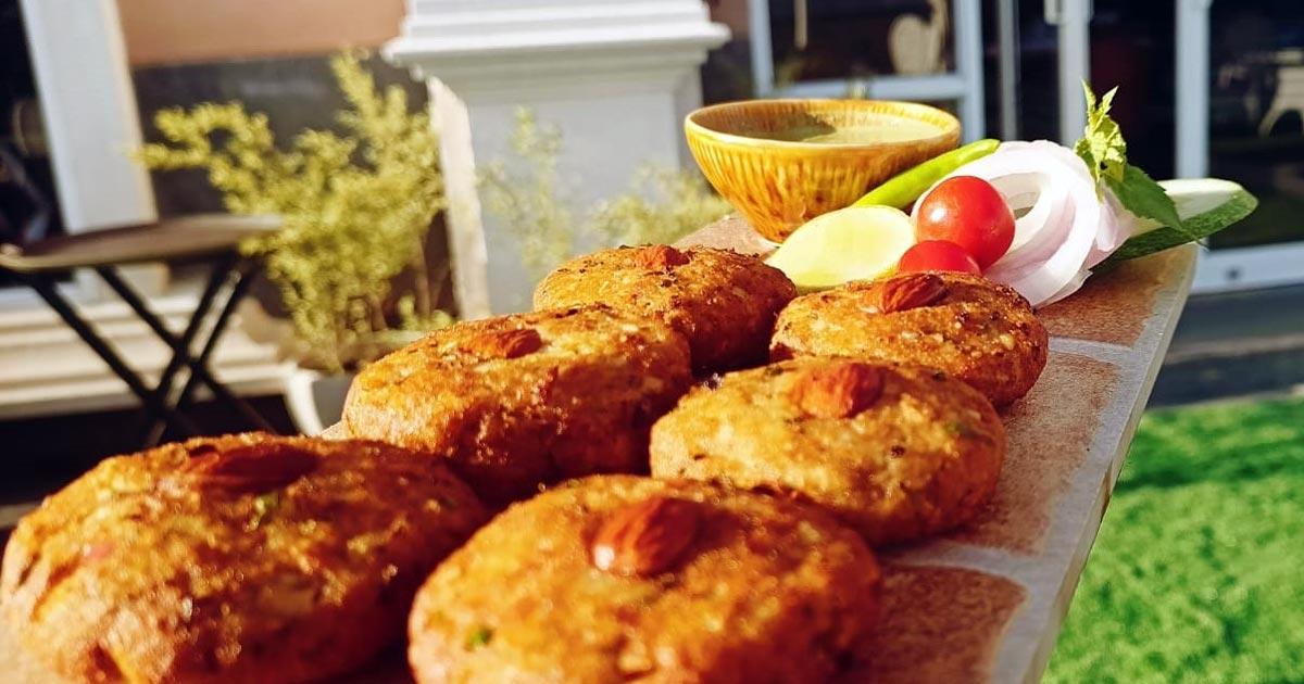 Garnish each tikki with an almond and serve warm with laccha pyaaz, slices of lemon and mint chutney.