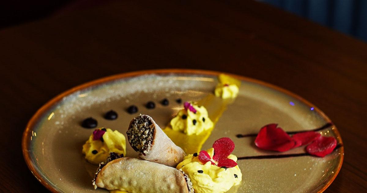 Place the stuffed cannoli on a the rabri (please see the pic above). - Using a piping bag, decorate the plate with a few swirls of chocolate sauce and then swirls of rabri.