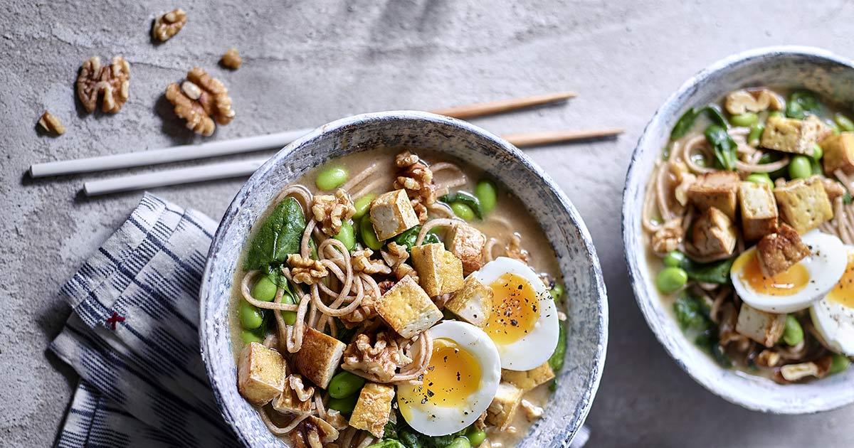 Take off heat, transfer to soup bowls and top with the tofu, chopped walnuts, halved eggs.
