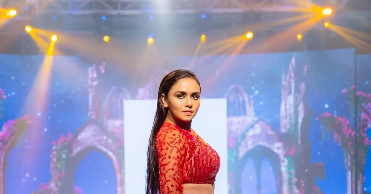 IMAGE: Amruta Khanvilkar sizzles in a fierce red look as she walks the ramp for Shruti Mangaaysh.