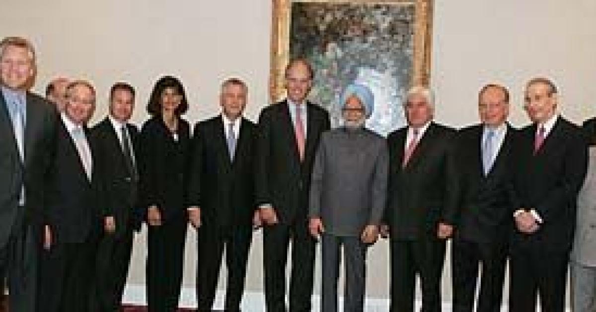 (Indian Ambassador to the US Ronen Sen and External Affairs Minister K Natwar Singh along with Prime Minister Manmohan Singh and top American CEOs at a luncheon in New York.)