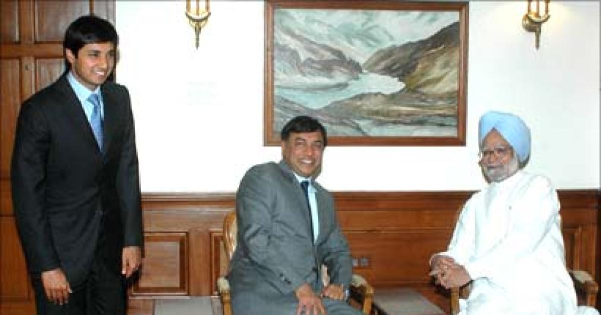 Steel magnate Lakshmi N Mittal  and his son Aditya called on Prime Minister Manmohan Singh in New Delhi on Friday, July 7, 2006. Photograph: Ranjan Basu/Saab Pictures Steel tycoon L N Mittal on Friday called on Prime Minister Manmohan Singh in New Delhi.