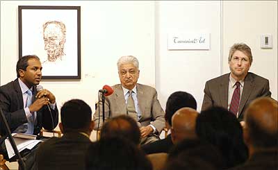 'Here is a guy who owns 80% of the company, but does not act like he is the king' October 30, 2006I think all three -– Wipro, Infosys and TCS -- are very similar companies. They have a lot of things in common although they do a few things differently a little bit. Primarily I used Wipro to tell the story of all of them effectively. I would say they (Wipro) are different in that Wipro is not quite market-oriented as Infosys and they are very engineering (oriented); they think like engineers and they are a very serious company, very focused on the projects. Another thing different is they grew their engineering outsourcing, hardware engineering, chips and all that kind of stuff. That is 35 percent of their technology revenues and that is a big business. In fact, I believe in the long term that is going to be one of the best businesses for the Indians as software programing becomes more of a commodity done anywhere in the world. During your interaction with him what impressed you most about Azim Premji? Premji is really a very wise person. I have covered the technology industry for many years and I have met with a lot of people who are very aggressive, charismatic and energetic, but they are not necessarily wise. Premji is not an egotist. He very much thinks a lot about what are the basic things that must be done to build an excellent company like Wipro and what are the characteristics of a strong management team. Here is a guy who owns 80 percent of the company, but he does not act like he is the king. He is the leader and he sends this message clearly about open-ness, honesty and those kinds of things. One of the things that several other people mentioned to me is the zero politics management in Wipro. They have vigorous discussions and the best ideas win. I talked to Vivek Paul after he left the company to check the veracity of this and he told me that this is true or it is as close as you can come. I was very impressed with his (Premji's) management style and philosophy. Image: Columbia University journalism Professor Sreenath Sreenivasan, Wipro Chairman Azim Premji and Steve Hamm at the launch of Bangalore Tiger in New York, October 24, 2006. Photograph: Paresh Gandhi