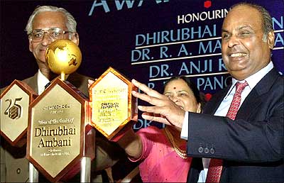 Dhirubhai Ambani poses with his 'Man of the Century' trophy , as Governor of Maharashtra P C Alexander (L) looks on during the CHEMTECH-CEW awards on November 8, 2000 in Mumbai. Also sesen in the center is Kokilaben Ambani.