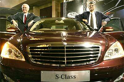 Managing Director and Chief Executive Officer of DaimlerChrysler India Wilfried G. Aulbur (L) and Director of Corporate Affairs and Finance DaimlerChrysler India Suhas Kadlaskar (R) pose with S-Class S320 CDi L