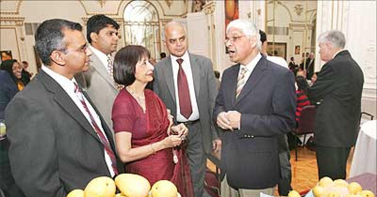 Actress Madhur Jaffery strikes a conversation with Minister of State for Industry Ashwani Kumar (right) at the launch of Indian mangoes at the Indian Consulate in New York on Thursday.