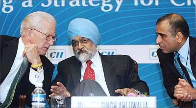 US Ambassador to India David C Mulford (L), chairman and MD Bharti Enterprises, Sunil Bharti Mittal (R) and Deputy Chairman Planning Commission Montek Singh Ahluwalia (C) during a conference in New Delhi.