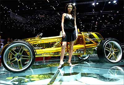 Models stand next to a Rinspeed Exasis concept car at the 77th International Motor Show on March 7, 2007 in Geneva, Switzerland. The car show was held at the Geneva Palexpo and is arguably the most influential for manufacturers.