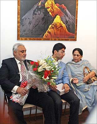 Image: Abhinav Bindra (C) talks with his mother Babli Bindra (R) and father A S Bindra (L) while waiting to meet Congress President and United Progressive Alliance government Chairperson Sonia Gandhi | Photograph: Prakash Singh/AFP/Getty Images