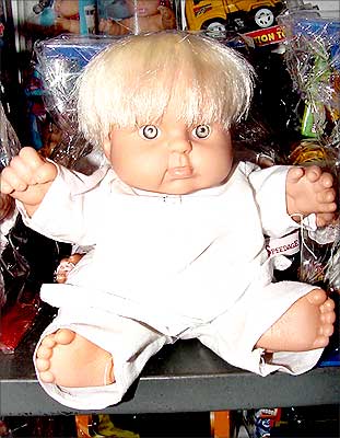 Image: A plump doll, called Laluji, on the shelves of a toy store in Patna.