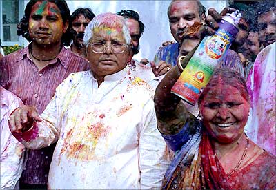 Image: Lalu and his wife Rabri Devi celebrate Holi, the festival of colours.