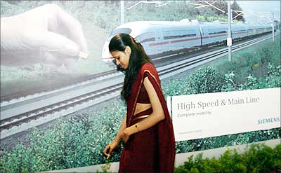 Image: An Indian Railways employee near a poster that shows Lalu's plan to have high-speed trains plying on Indian tracks.