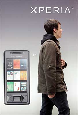 A fairgoer walks past an ad for Sony Ericsson's Xperia mobile device at the CeBIT trade fair in Hanover on March 4, 2008.