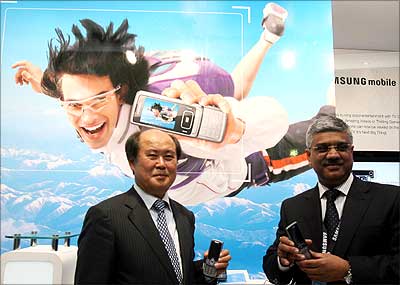 CEO and President Samsung Electronics South West Asia, H.B. Lee (L) and country head, Samsung India Telecommunications India Limited, Sunil Dutt pose with Samsung SGH i450 multimedia cellular telephones
