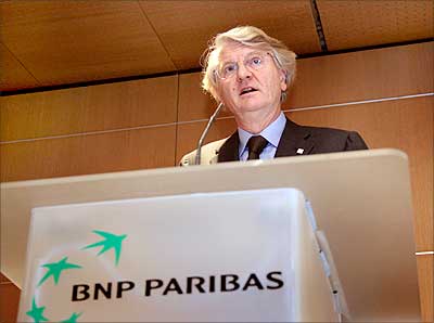 Image: BNP Paribas Deputy General Director Georges Chodron de Courcel (right) talks to his counterpart Jean Clamon, during a press conference in Paris.| Photograph: Jacques Demarthon/AFP/Getty Images