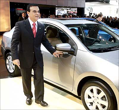 Image: Nissan chief executive Carlos Ghosn shows off the new 2007 Nissan Sentra at the North American International Auto Show at Cobo Hall in Detroit, Michigan. The NAIAS is the world's largest auto show. Photograph: Jeff Haynes/AFP/Getty Images