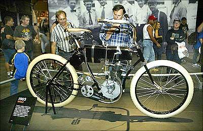 Image: The first Harley-Davidson motorcycle built in 1903 is displayed during the Harley-Davidson 100th Anniversary | Photograph: Daniel Berehulak/Getty Images