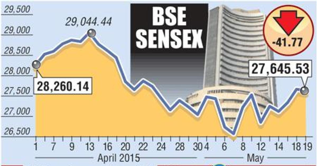 Snapping a two-day rally, the Sensex ended at 27,645, lower by 41 points and the Nifty held on to the technically crucial 8,350 mark to settle at 8,365, down 8 points.